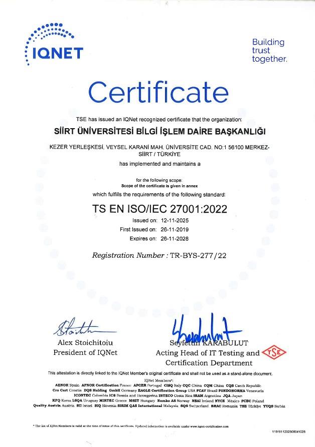 Üniversitemizde başlatılan kalite çalışmaları çerçevesinde Bilgi İşlem Daire Başkanlığı, Türk Standartları Enstitüsü (TSE) tarafından gerçekleştirilen dış tetkik sürecini başarıyla tamamlayarak, IQNet (Uluslararası Belgelendirme Ağı) onaylı ISO 27001:2022 Bilgi Güvenliği Yönetim Sistemi Kalite Standartı belgesini 3 yıllığına yenilemeye hak kazanmıştır.